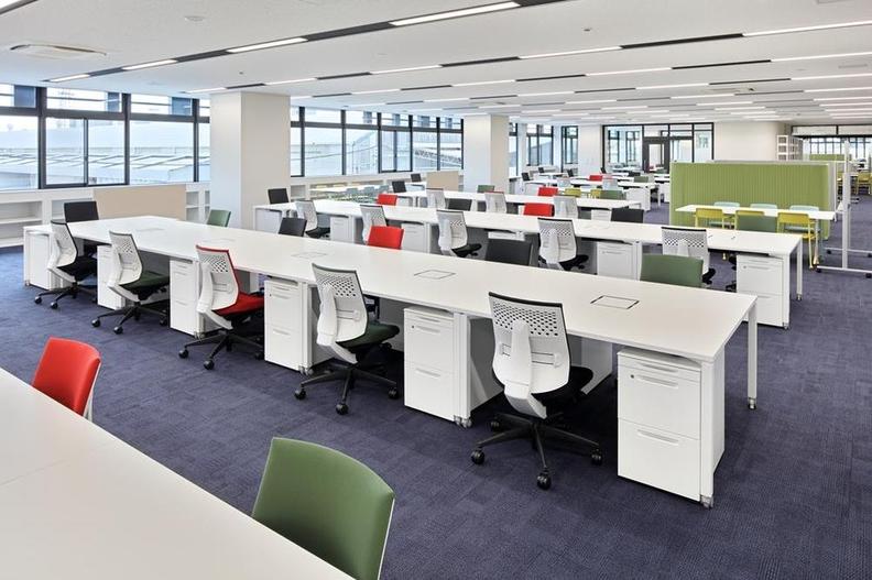執務スペース内は白を基調とすることで、明るく活気のある印象に。デスクは、移動や連携可能なコクヨのWORKFIT(ワークフィット)を採用。