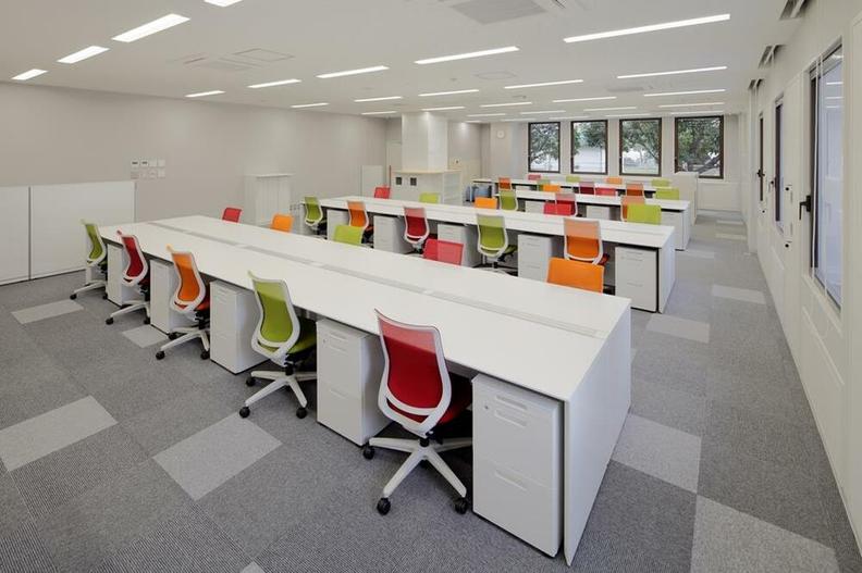 執務室内全体が見渡せる、オープンオフィス。椅子の色は1色で統一するのではなく、3色使用。ランダムに配置することで、執務室内が明るく、活気のある印象に。