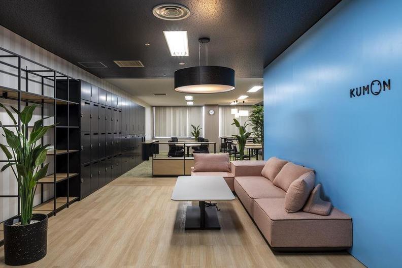 エントランスはブランドカラーのブルー(KUMONブルー)を採用しています。天井もブラックにすることでシックな設えにしました。またエントランスからワークスペースが見えることで、より人の気配を感じやすく、入りやすい空間を演出しました。
