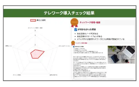 テレワーク機器の準備・整備状況だけでなく、オフィス環境や運用、コミュニケーションなどの全5項目で総合的に診断